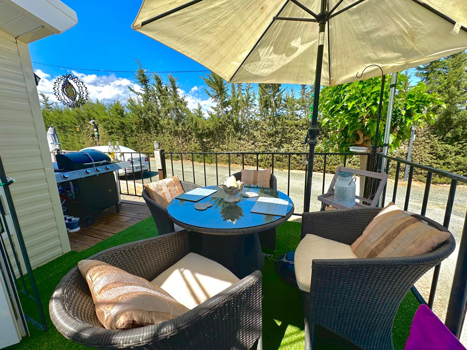 Large wrap around decked area to enjoy the sunshine. Wooden shed, with a washing machine with mains power.