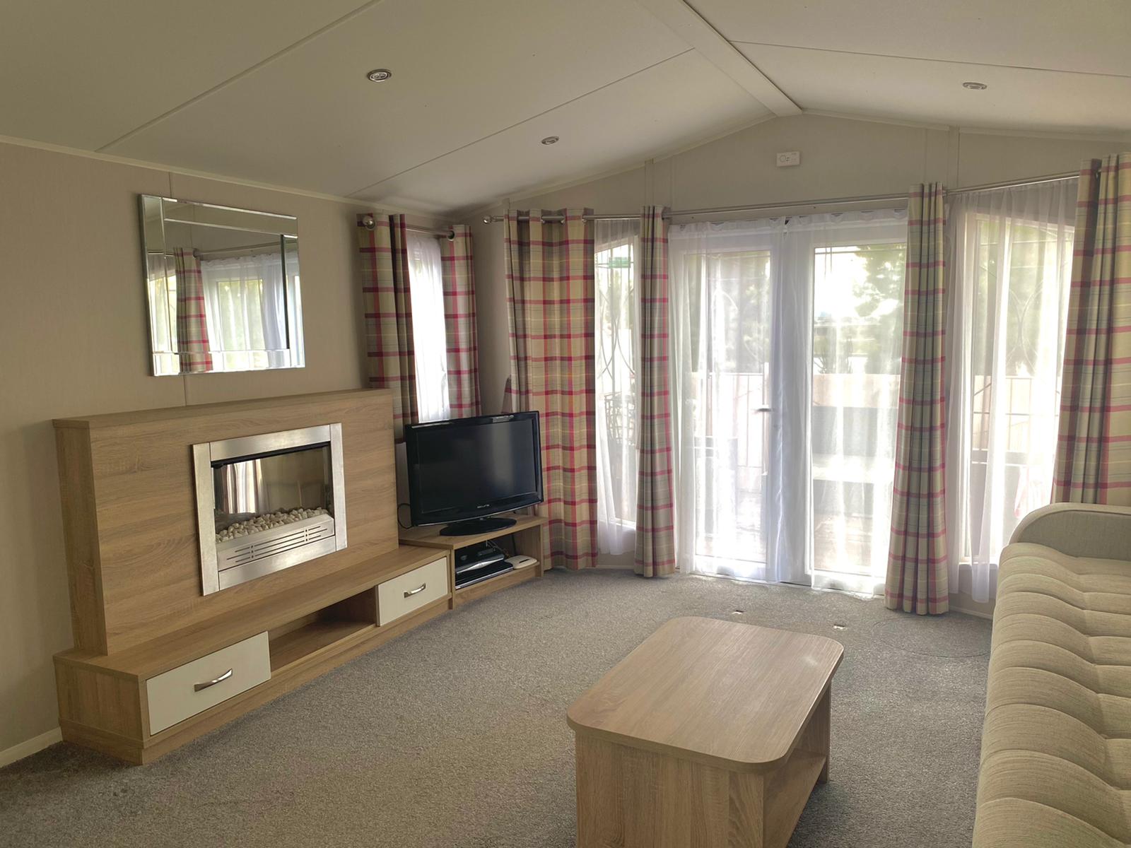 Patio doors in the living area provide natural light, and bring the outdoors inside. The mobile home has energy efficient White PVCu double glazed windows and doors.