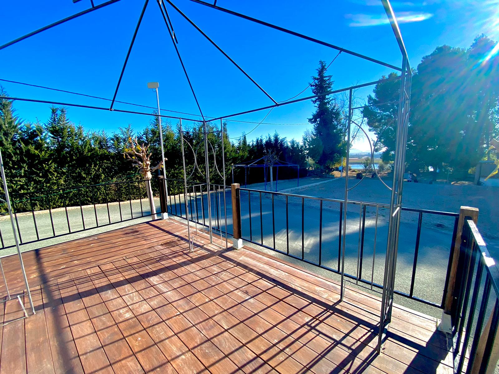 Large wrap around decked area to enjoy the sunshine. Wooden shed, with a washing machine with mains power.