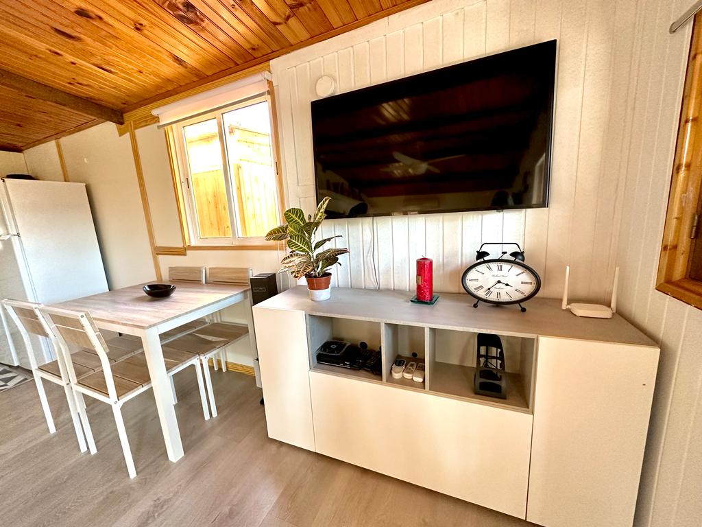 living area has a corner sofa, pellet burning fire, tv, storage unit