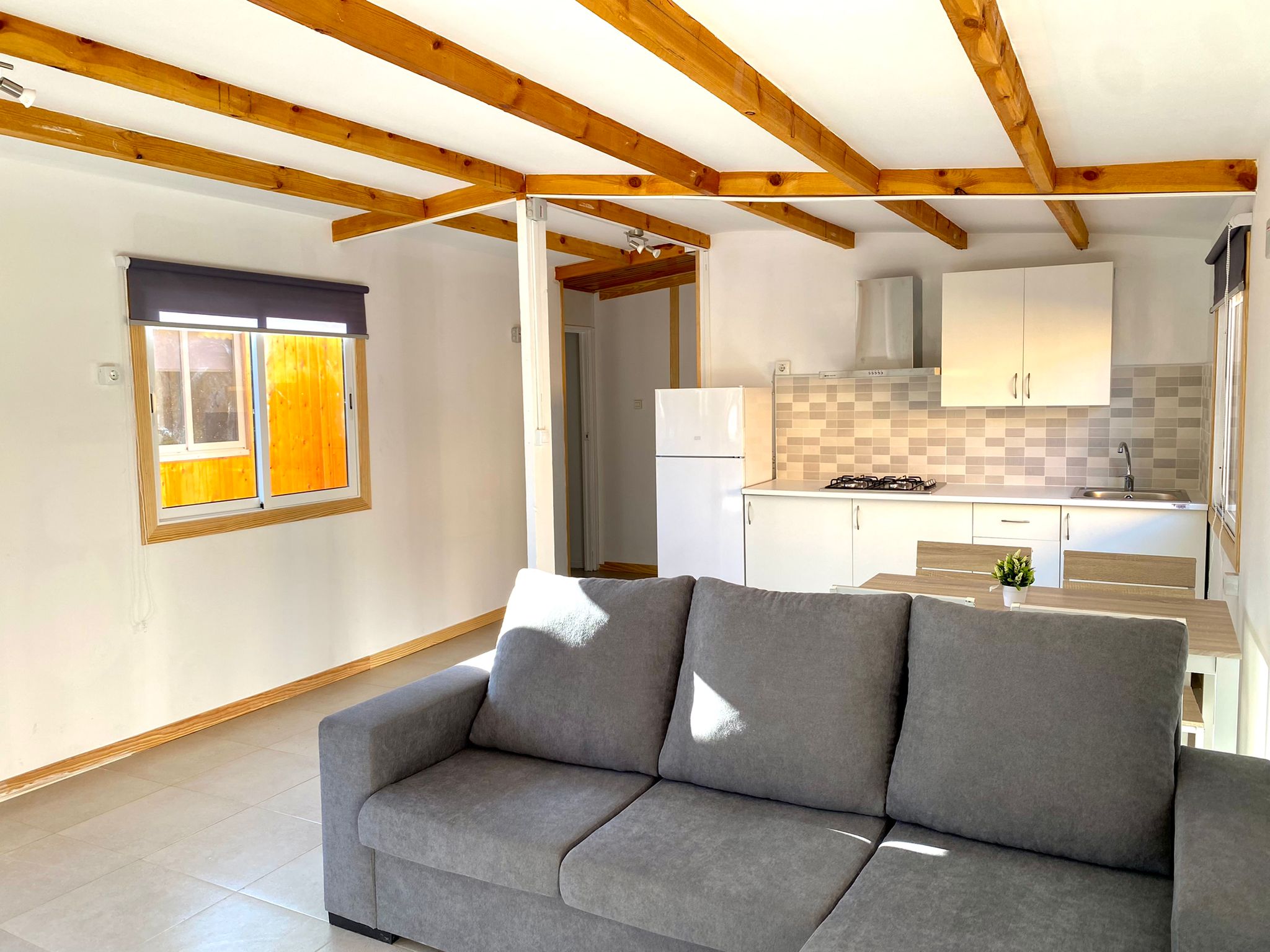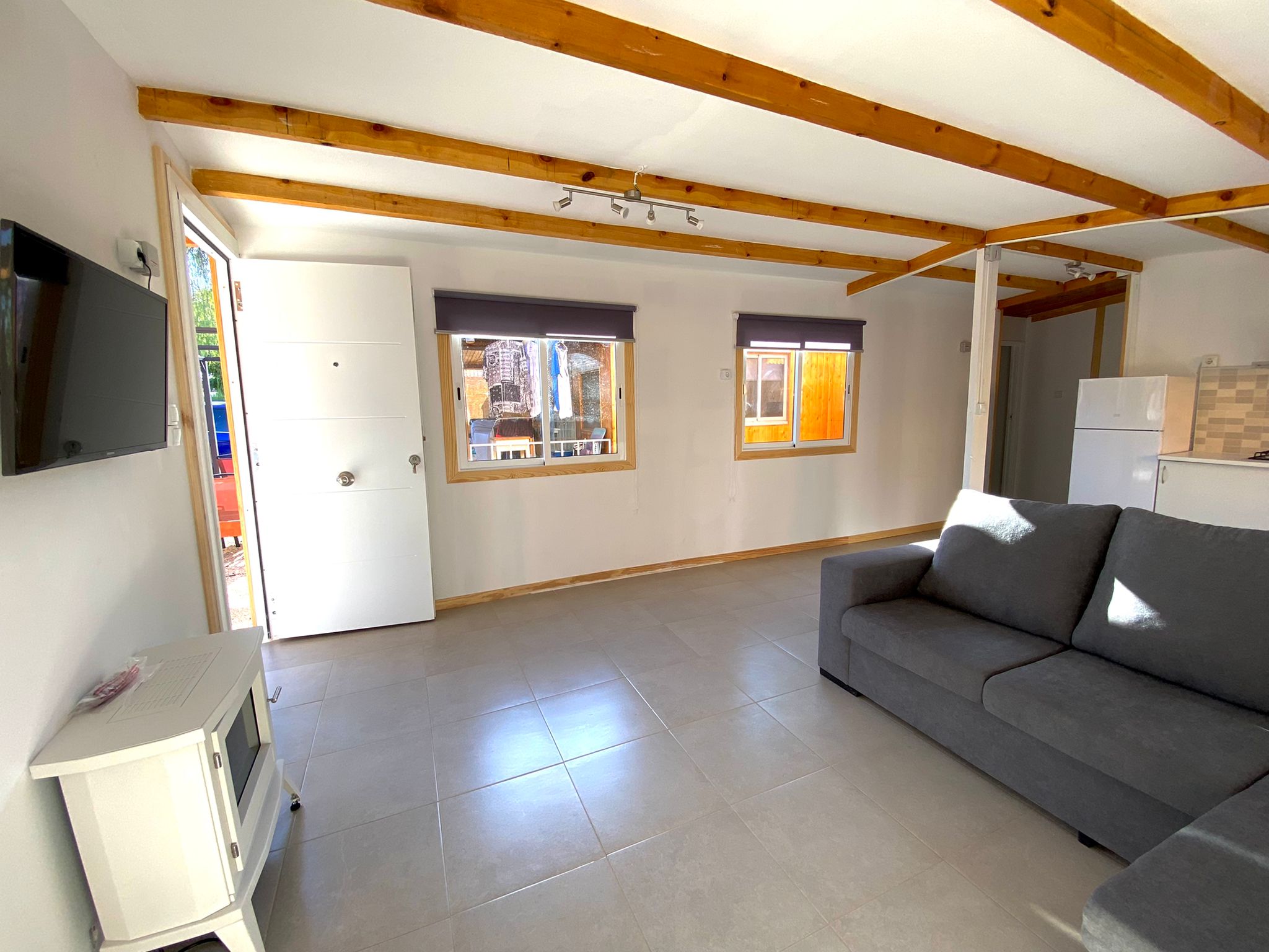 Living room has tv, live fire , table and chairs ,sofá cheslong, and air condition in the bedroom.