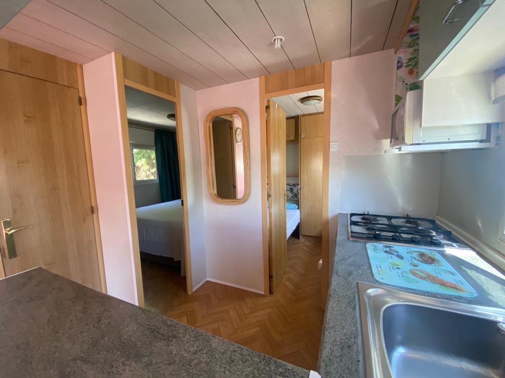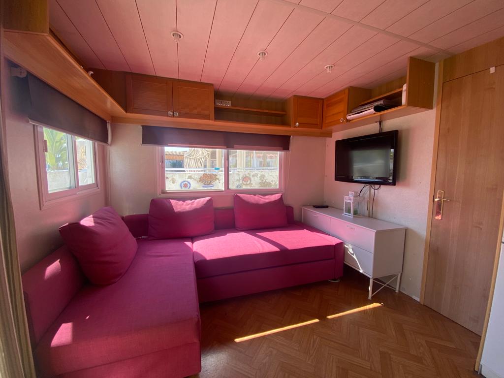 Static caravan 28 ft x 13ft with a brand new L shape decking ( cost 3600€) with two bedrooms , small walk in wardrobe, Kitchen , living-room And bathroom. All furniture in the photos are included. Big plot , área for the car And very near the swimming pool. Ground rent 1500€ every six months.