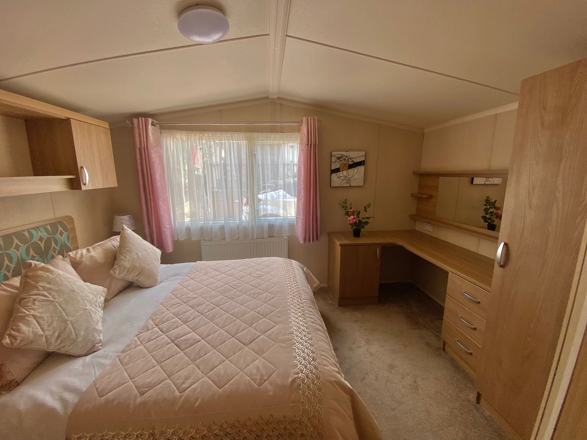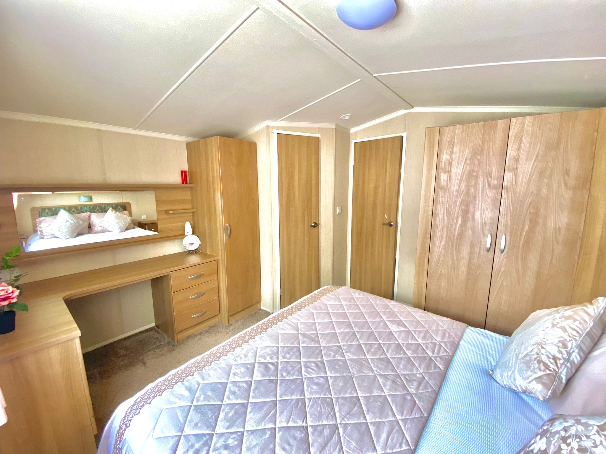 The master bedroom is huge, with wardrobe, , upholstered headboard, bedside cabinets and en-suite with toiler and sink.