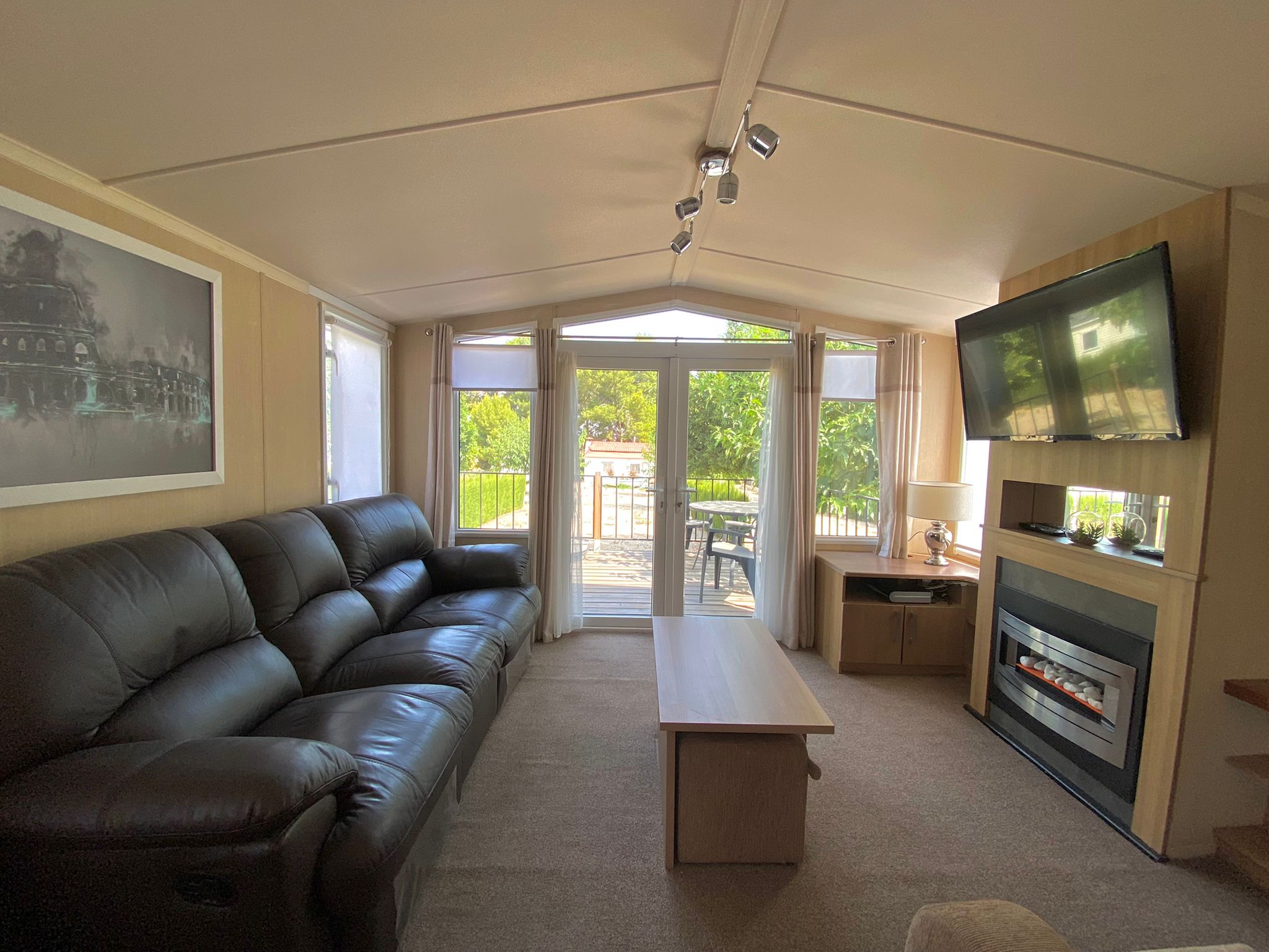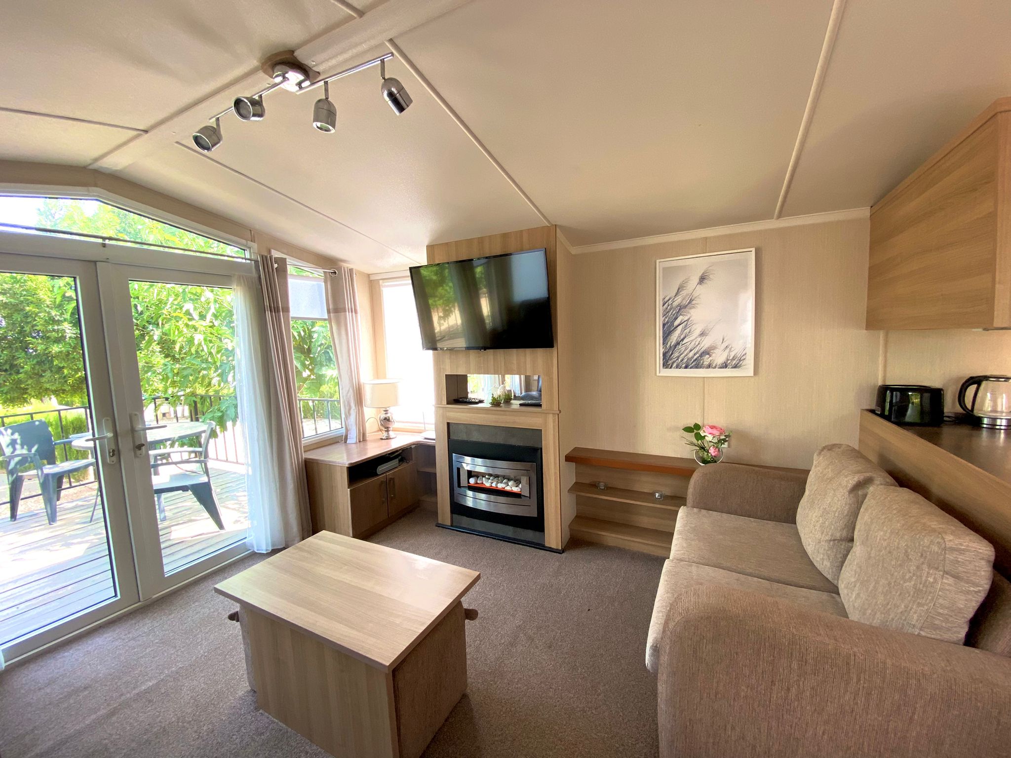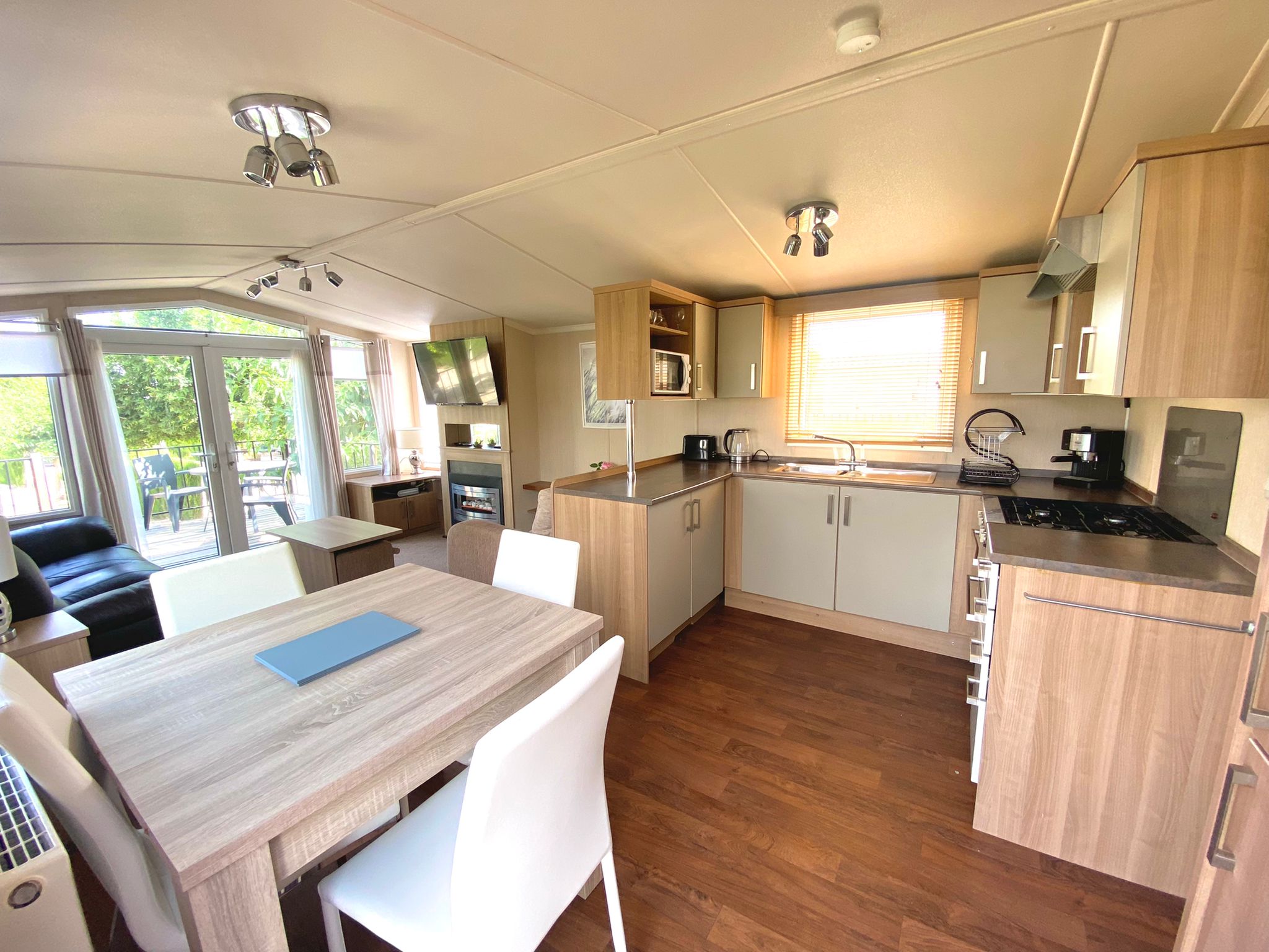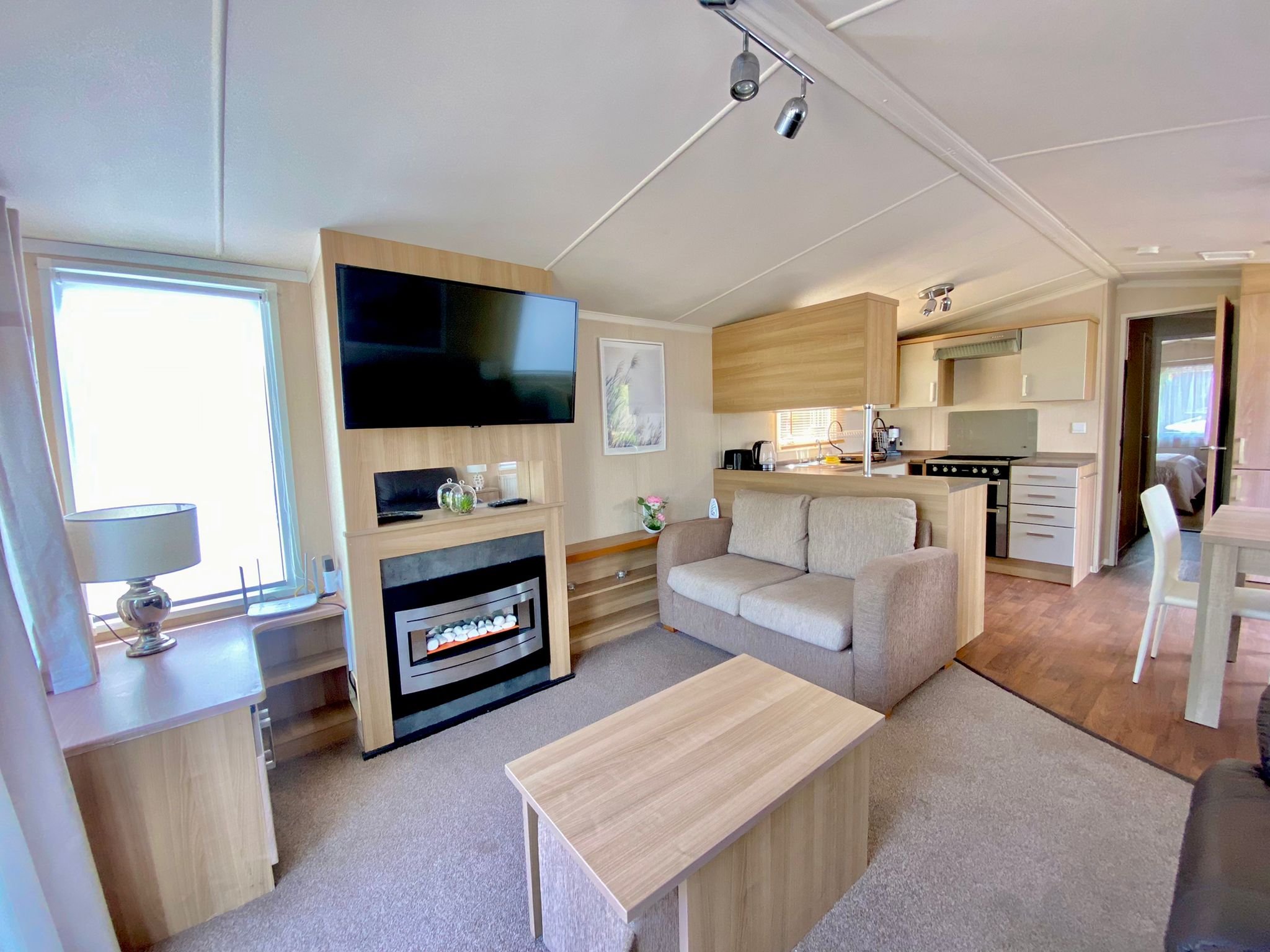 A superb Swift Bordeaux Caravan 38x12ft. with full double glazing, gas central heating, Super spacious living area with two sofas, coffee table, tv and feature fireplace.